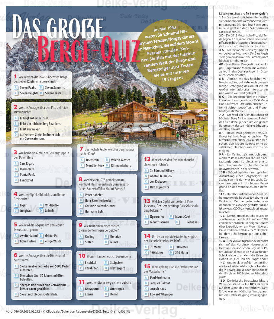 Im Mai 1953 waren Sir Edmund Hillary und Tenzing Norgay die ersten Menschen, die auf dem Mount Everest standen. Kennen Sie sich mit der faszinierenden Welt der Berge und Bergsteiger aus?