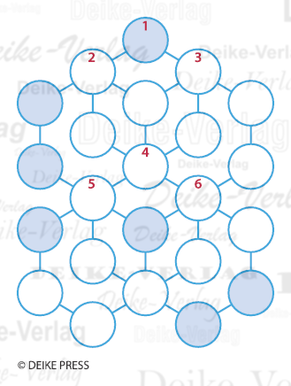 Ausgehend von den Kreisen mit den Ziffern, sind sechsbuchstabige Begriffe im Uhrzeigersinn so in die Felder einzutragen, dass jeweils ein geschlossenes Sechseck entsteht.